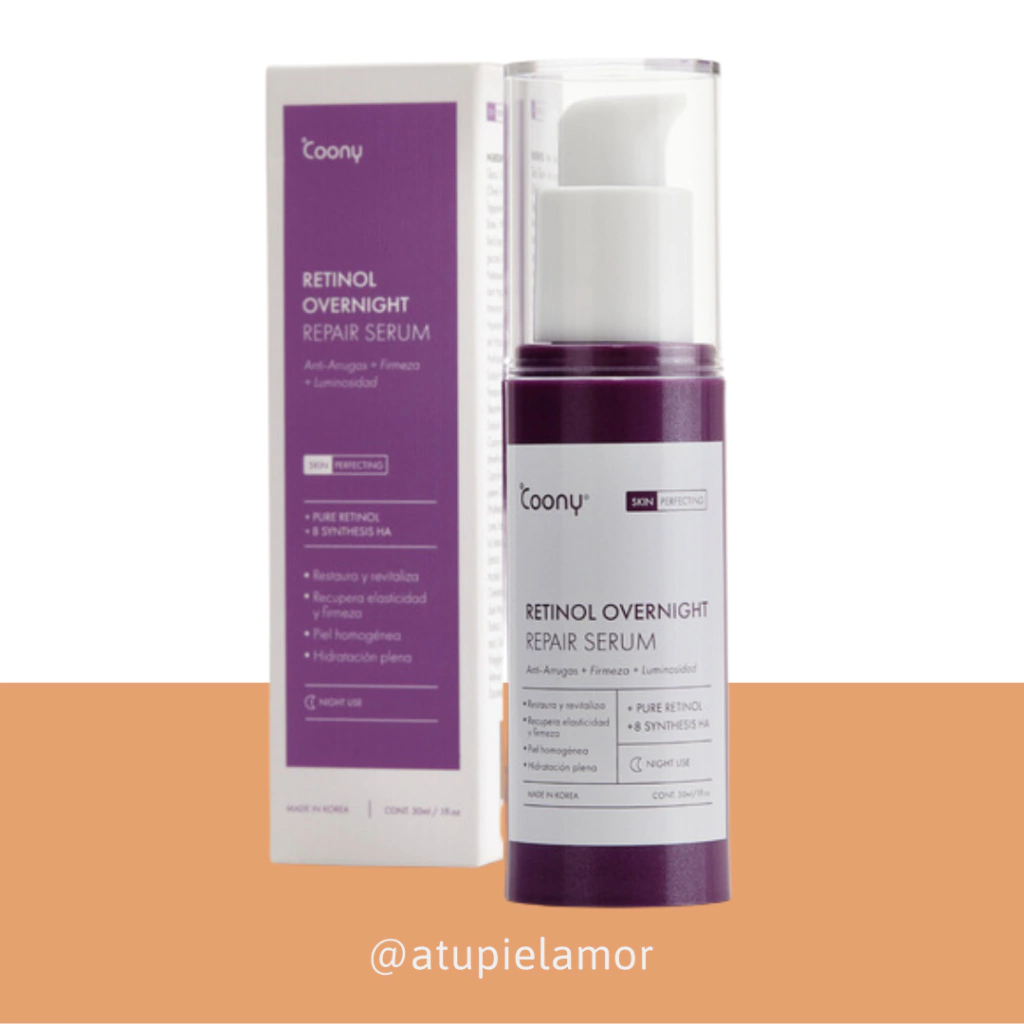 COONY RETINOL OVERNIGHT REPAIR SERUM ayuda eficazmente a corregir los signos del foto-envejecimiento, mejorando el aspecto de las arrugas profundas, líneas de expresión y tez irregular. Se logra una piel radiante, con un efecto renovador, devolviéndole elasticidad y plena firmeza. El Retinol puro (PURO, sin uso de derivados o mezclas diluídas de inferior calidad, y en su dosificación de uso seguro y eficaz del 0,2%) naturalmente estimula la síntesis de colágeno y ayuda a la despigmentación de la piel para un tratamiento anti-manchas. Su destacada formulación potencia la regeneración celular, y combinado con 8AH Octa-Hyaluronic Complex (8 diferentes síntesis de Ácido Hialurónico), logra restaurar la piel con plena hidratación y continua humectación.